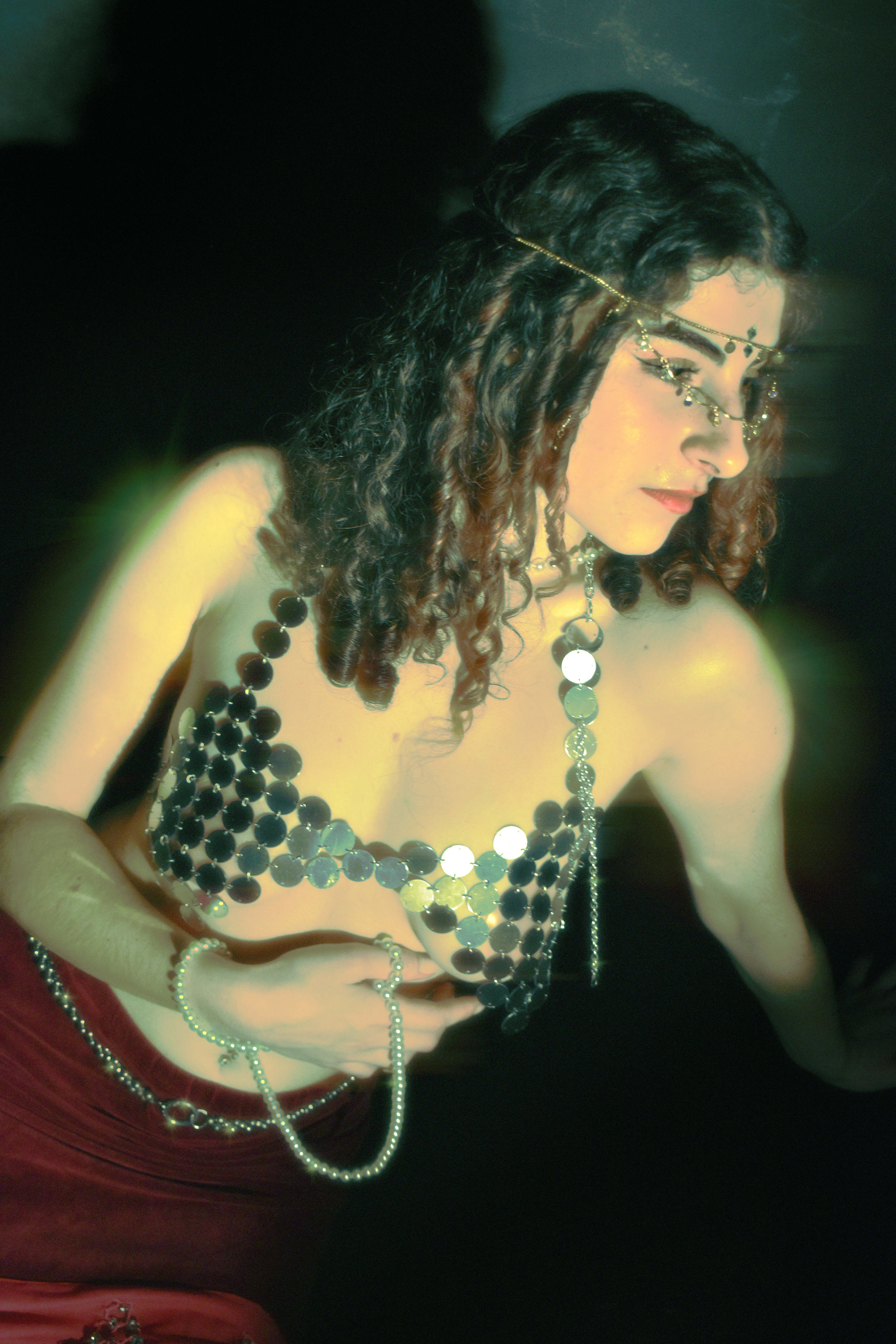 "The winds deriving from the Aegean sea, the coins and jewels draping from her skirt, jingling from afar as they shimmer, entice energy souls from the undergrounds of femininity. She forges through their pain and births power into their divine spirits."
